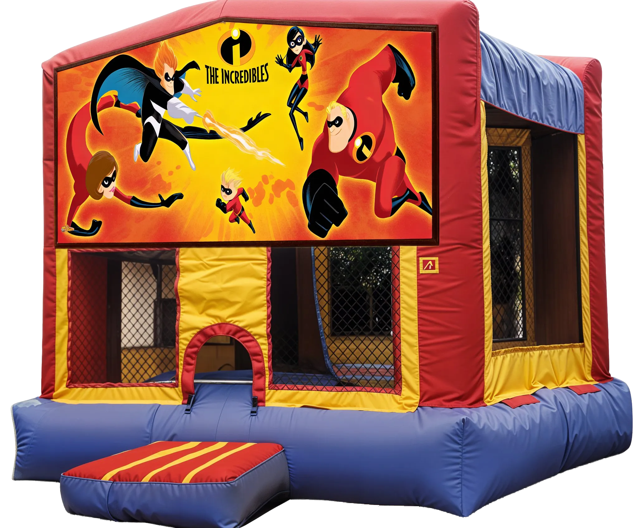 Mr. Incredible and his family are ready to have some fun right in your very backyard! This 18ft x 16ft size Incredibles Themed Moon Bounce is a great way to bring the movie to life at your party and give your kids a day full of fun. The bright banner and superheroes make it an instant hit; kids love it, and it always becomes a main attraction at the party.