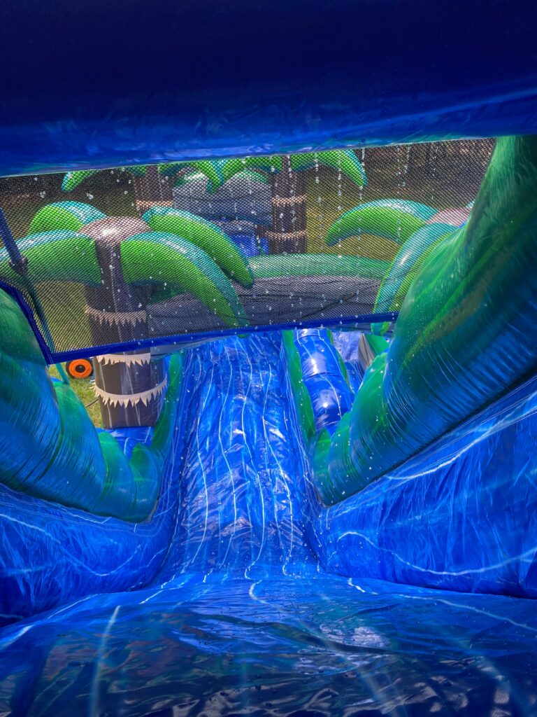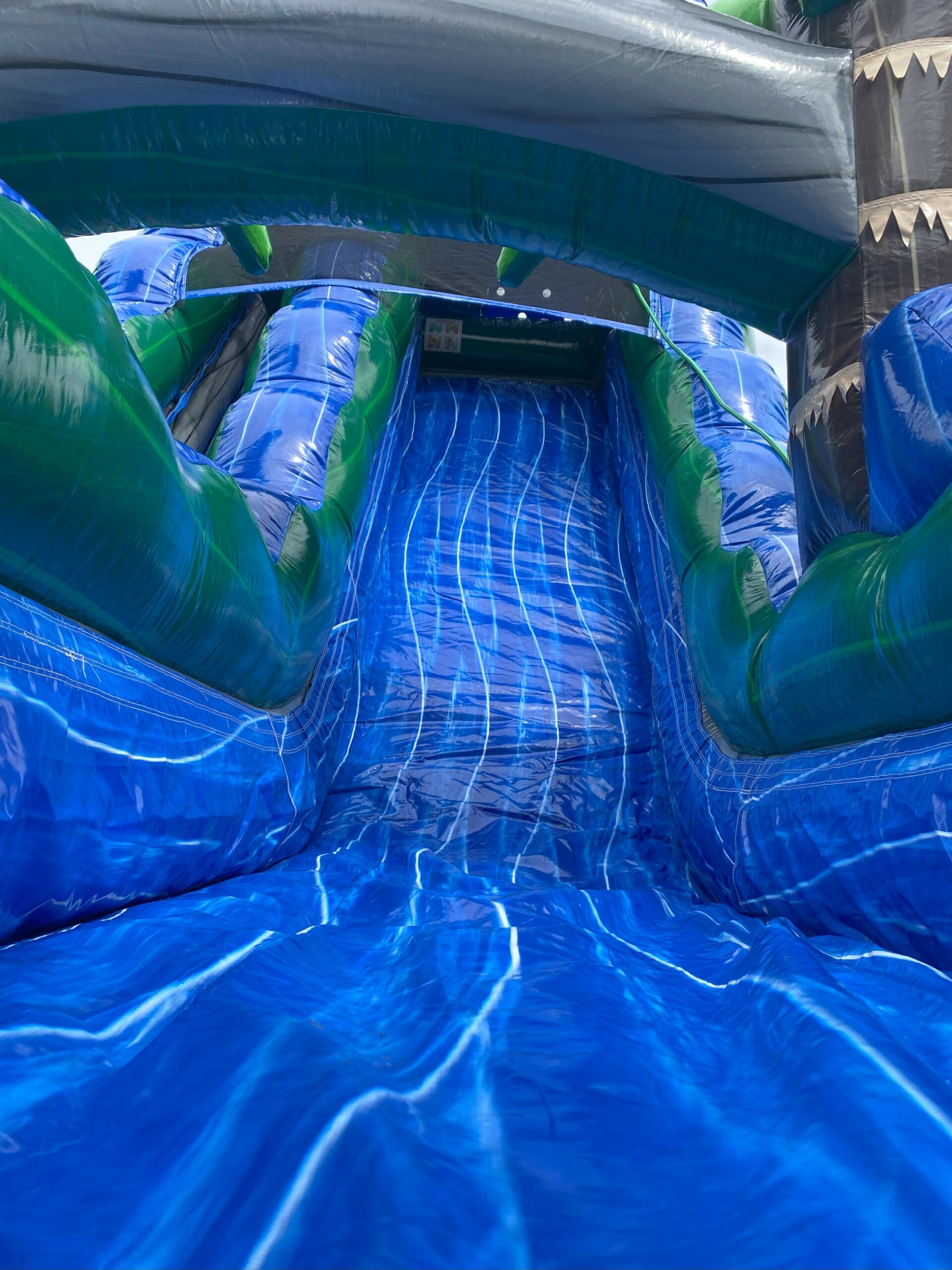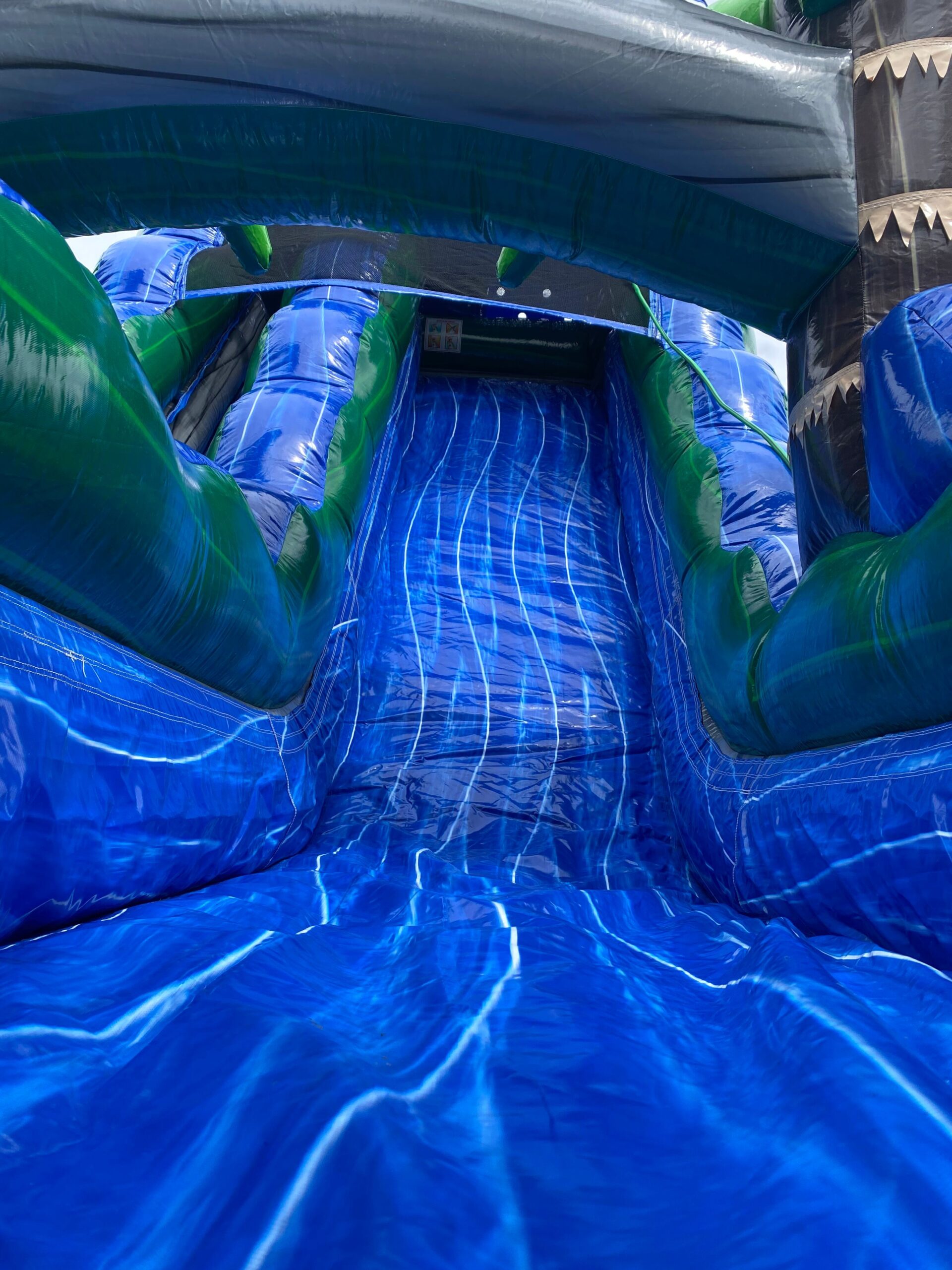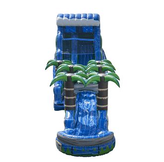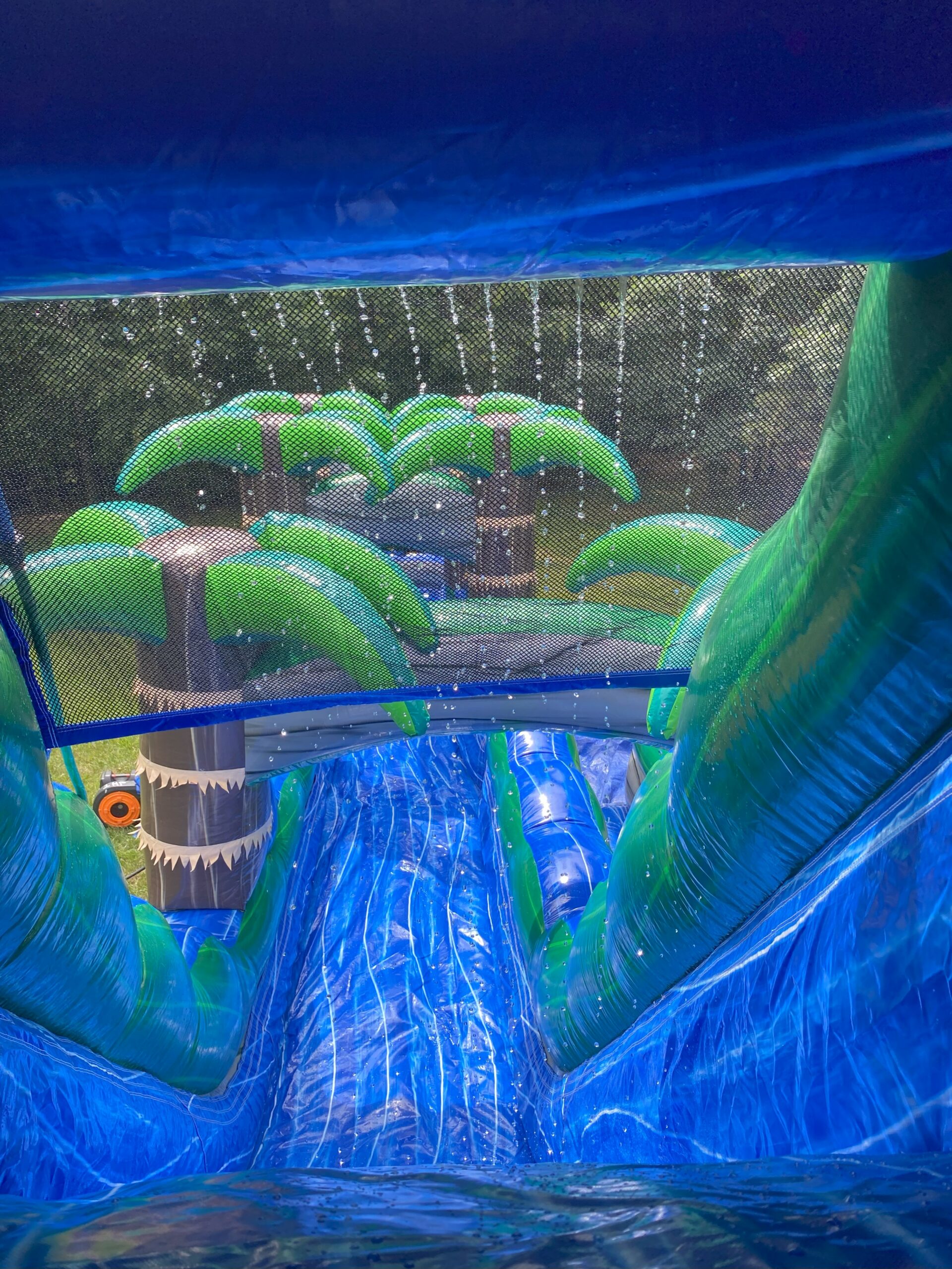 Bring tropical vibes to your summer party with our 18′ Blue Crush Tsunami Water Slide Slip-N-Splash Combo. It’s got all the best parts of your favorite slides in one. Climb up to take in the view, and get ready for a fast ride down the single lane into the palm-lined slip-n-splash tunnel before landing in the pool at the end for an exciting finish . It’s super fun and perfect for kids who love a thrill, making it a great option for camp days, school events or a summertime birthday party. Call to book yours today!