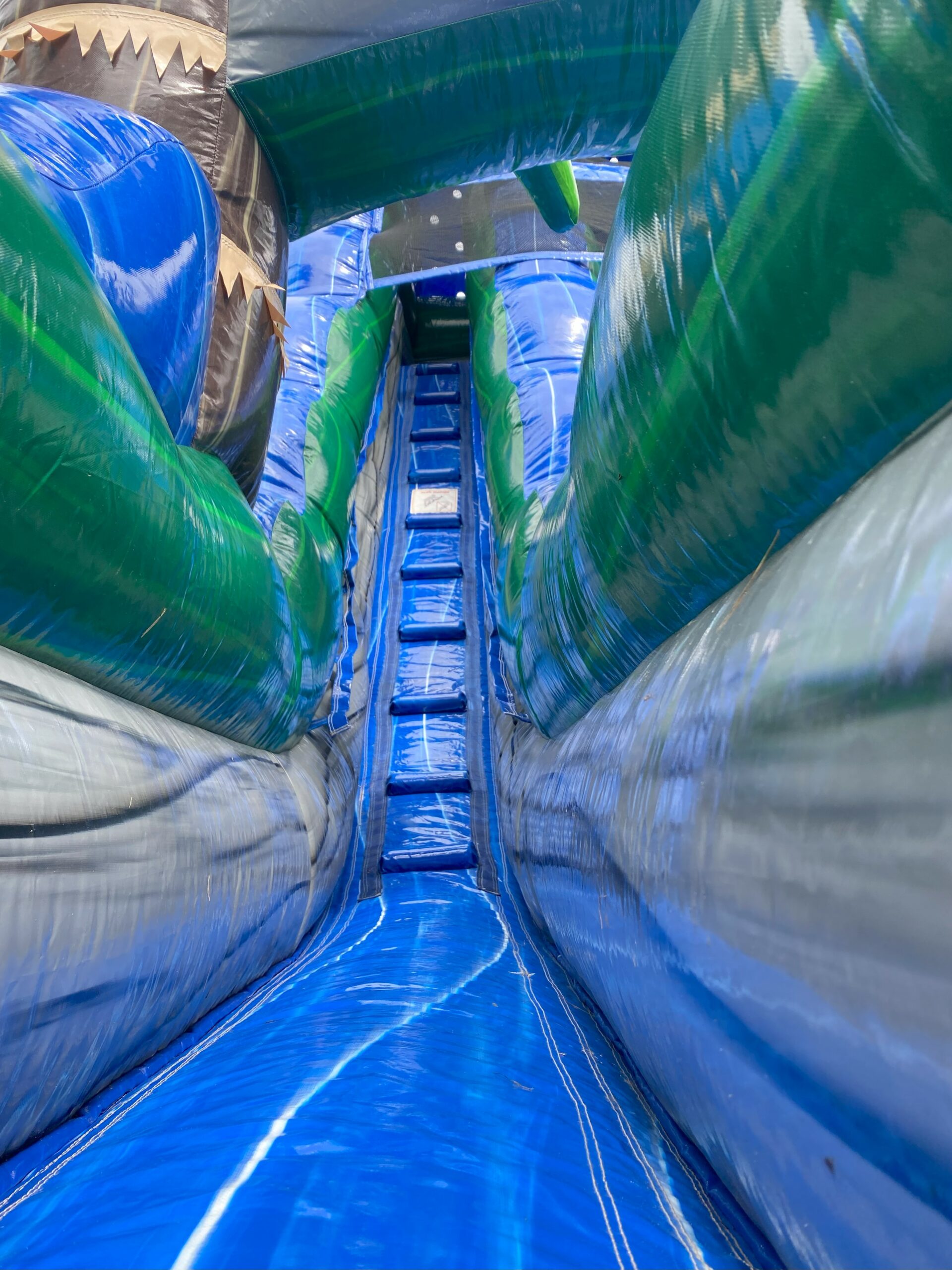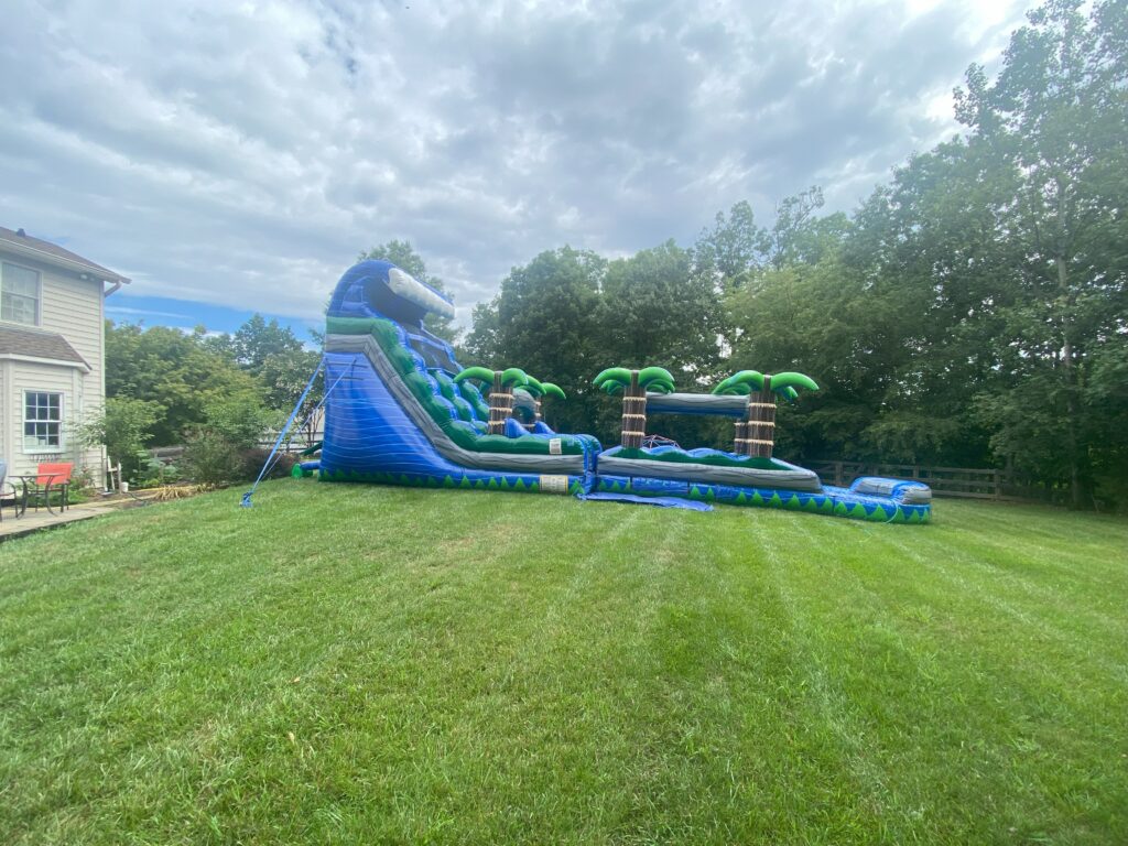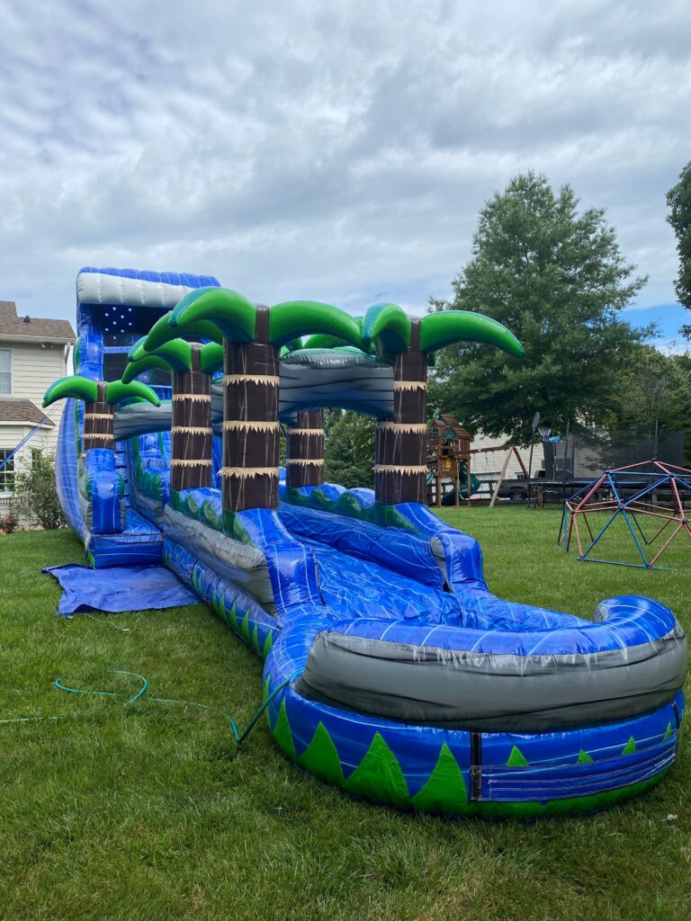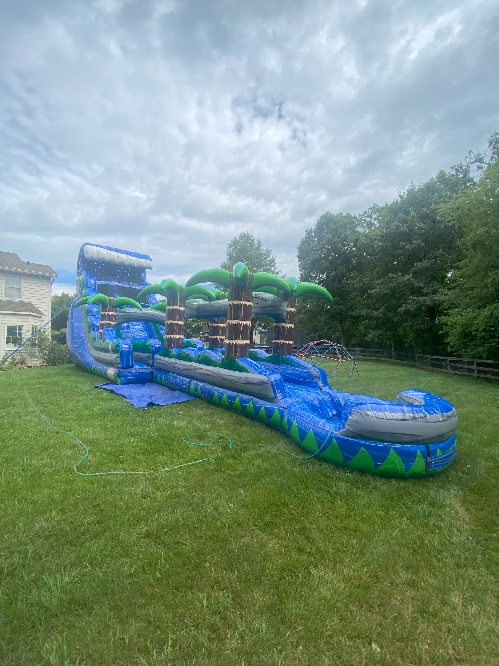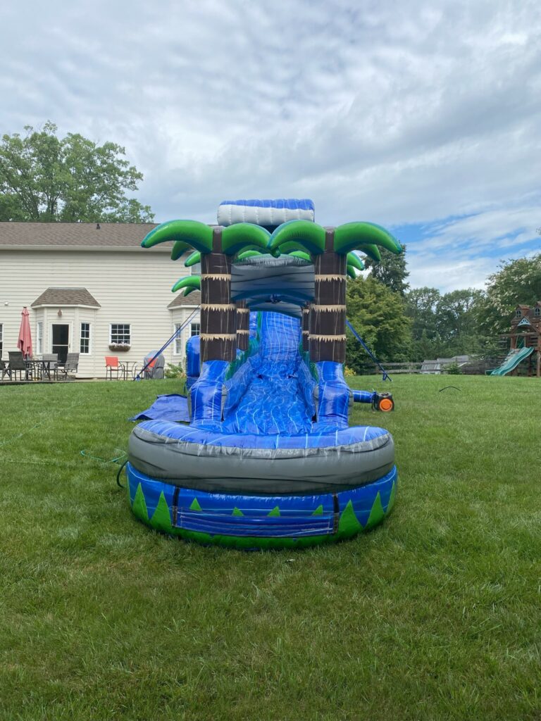 Bring tropical vibes to your summer party with our 18′ Blue Crush Tsunami Water Slide Slip-N-Splash Combo. It’s got all the best parts of your favorite slides in one. Climb up to take in the view, and get ready for a fast ride down the single lane into the palm-lined slip-n-splash tunnel before landing in the pool at the end for an exciting finish . It’s super fun and perfect for kids who love a thrill, making it a great option for camp days, school events or a summertime birthday party. Call to book yours today!