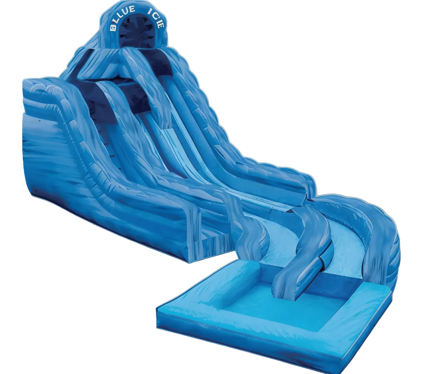 Astro Jump’s 20′ Blue Ice Dual Lane Water Slide is a favorite with our customers because it gives everyone options. It has two lanes, one lane is taller than the other, so kids and adults can pick their experience. Both lanes end in a big splash pool at the bottom, making it perfect for parties of all ages. If you love this slide but want to change up the look then check out our 20′ Crushed Ice Dual Lane Water Slide or 20′ Fire Rock Ice Dual Lane Water Slide for an exceptionally good time today!