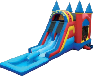 If you’re looking for a fun way to cool off this summer, the Blazing Double Dip Water Slide Combo W/Pool is a great choice. This combo lets kids jump, climb, slide and splash all in one place. The entrance ramp and the entire jumping surfaces are made with sturdy non-slip material to help keep everyone safe while they enjoy this inflatables many features .Kids enter through the front of the large bouncing area, turn left and choose one of the two climbing ladders before racing down the dual lane slide and splashing into the pool at the bottom. It’s a favorite for guests of all ages and always brings plenty of laughs. Check out our other Double Dip Water Slide Combo options and see which one fits your party best!